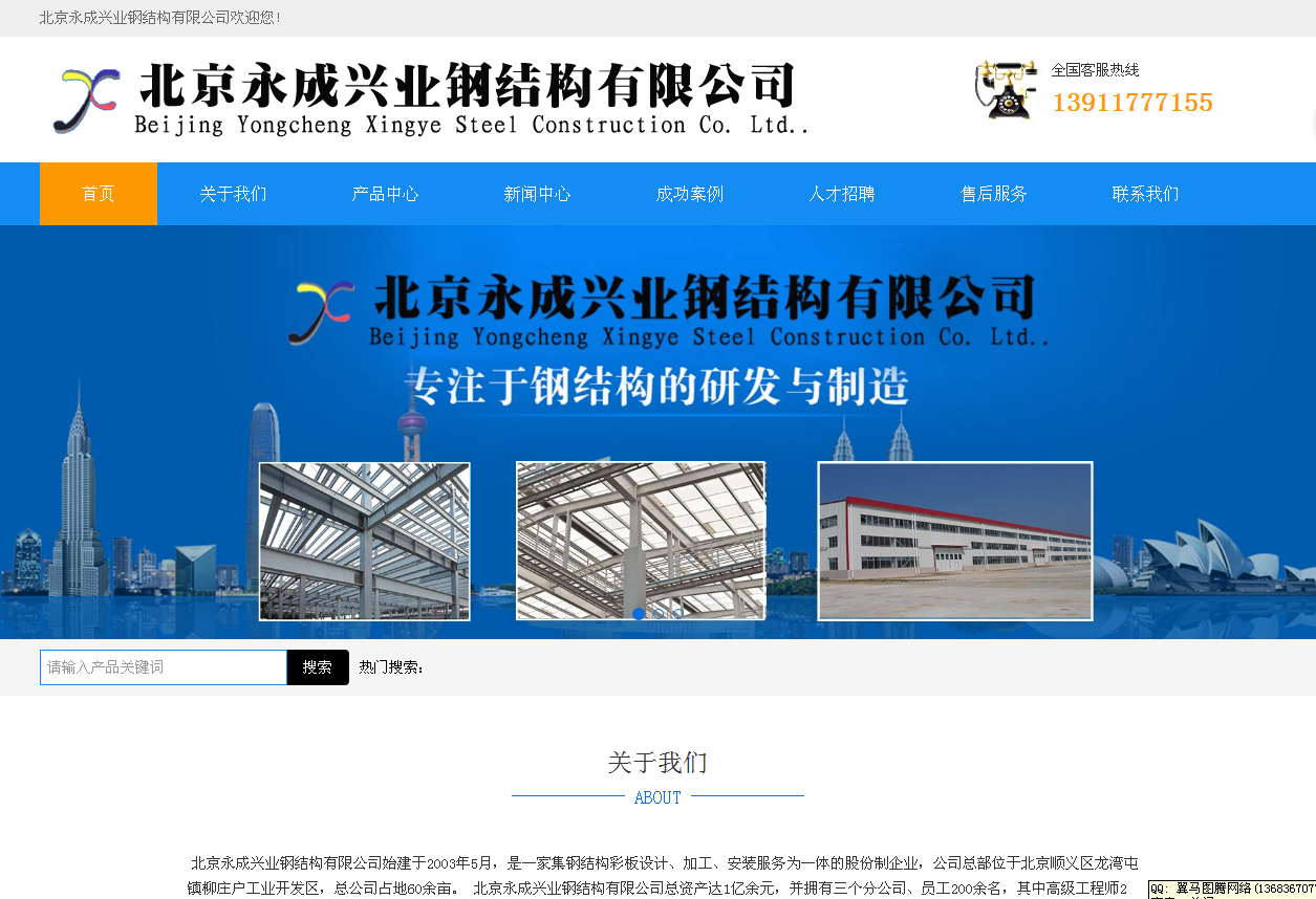 北京永成興業(yè)鋼結(jié)構(gòu)有限公司始建于2003年5月,是一家集鋼結(jié)構(gòu)彩板設(shè)計、加工、安裝服務(wù)為一體的股份制企業(yè),公司總部位于北京順義區(qū)龍灣屯鎮(zhèn)柳莊戶工業(yè)開發(fā)區(qū),總公司占地60余畝。 北京永成興業(yè)鋼結(jié)構(gòu)有限公司總資產(chǎn)達1億余元,并擁有三個分公司、員工200余名,其中高級工程師2名,專業(yè)設(shè)計師8名,經(jīng)濟管理師2名,工程師5名,助理工程師15名,生產(chǎn)管理人員18名,工程與車間專業(yè)技術(shù)人員100余名。北京公司下屬北京永成興業(yè)鋼結(jié)構(gòu)有限公司、北京永成興業(yè)輕鋼彩板有限公司,為了擴大公司的規(guī)模,支持西..