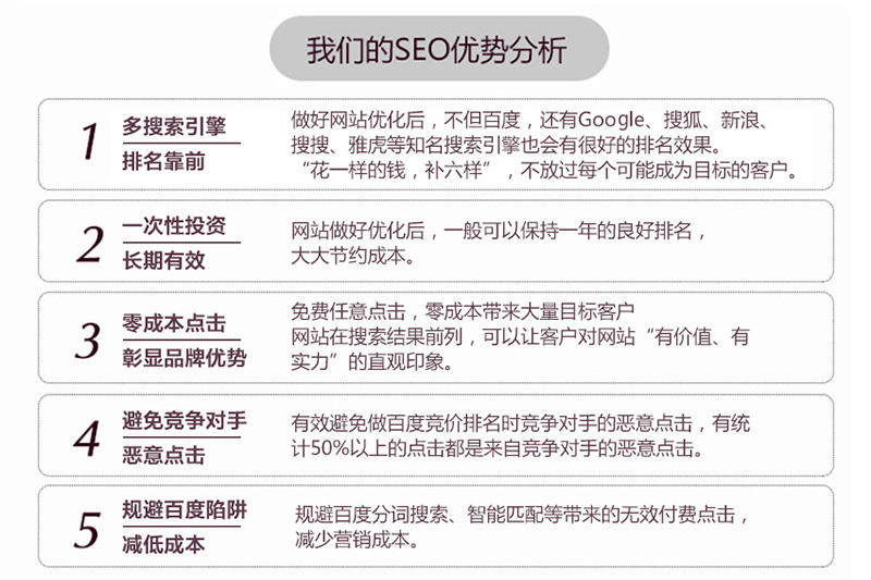 超過100個精準(zhǔn)關(guān)鍵詞一次性投放,全網(wǎng)覆蓋,一次到位,實現(xiàn)“一站式”營銷平臺。【全程跟蹤服務(wù)指導(dǎo)保證發(fā)布效果】【霸占各大搜索引擎,瞬間收錄排名】【點擊不收費成本低廉】【后臺全程監(jiān)控】【排名效果達不到承諾,無條件退款】